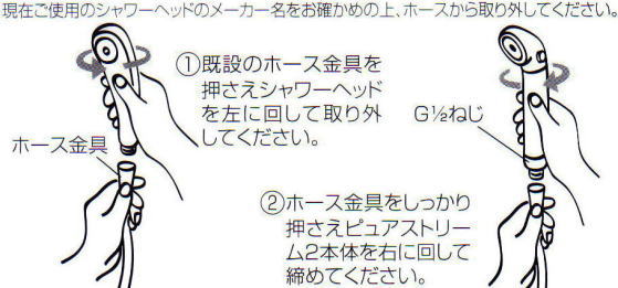 ![]() ご使用のシャワーヘッドのメーカー名をお確かめの上、ホースから取り外して下さい。 ![]() |