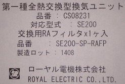 | ローヤル電機 全熱交換型換気ユニット SE200R/RS用室内吸い込み側フィルター |